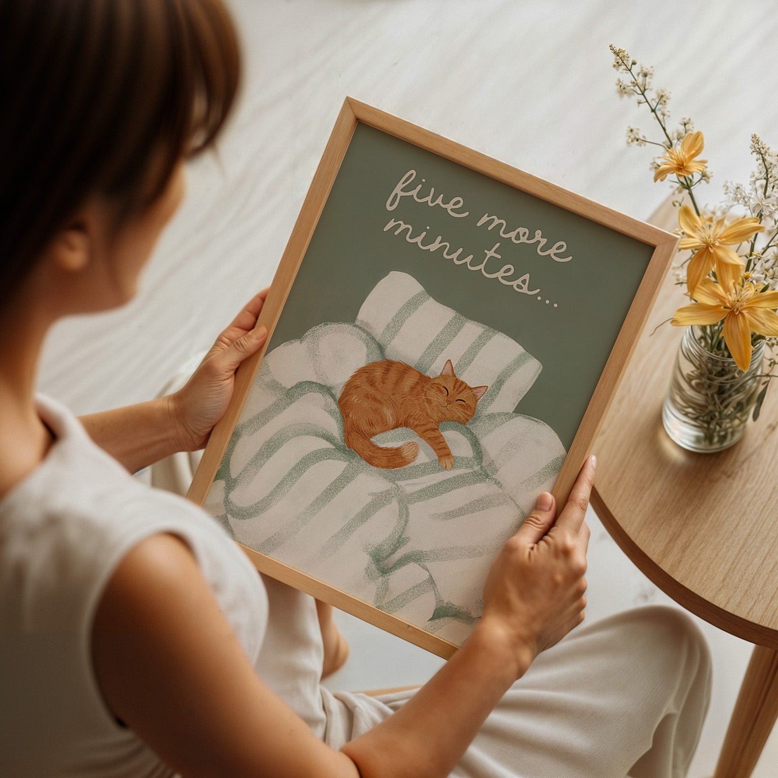 Hit snooze on stress with this adorable bedroom print featuring a sleepy cat snuggled into a comfy bed under the words “Five More Minutes.” Designed in soothing green tones, it brings a sense of calm, comfort, and relatable morning mood to any space.